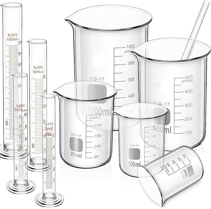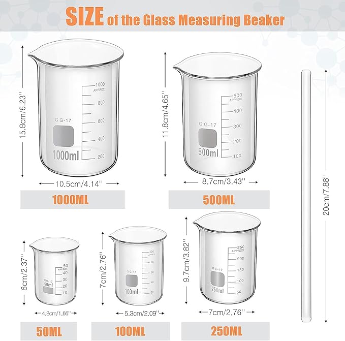 The 10-piece Glass Measuring Beaker Kit includes graduated beakers and cylinders ranging from 5ml to 1000ml, along with a stirring rod. Made from thick, durable glass, it’s ideal for accurate measurements and experiments in science labs, schools, and educational projects.