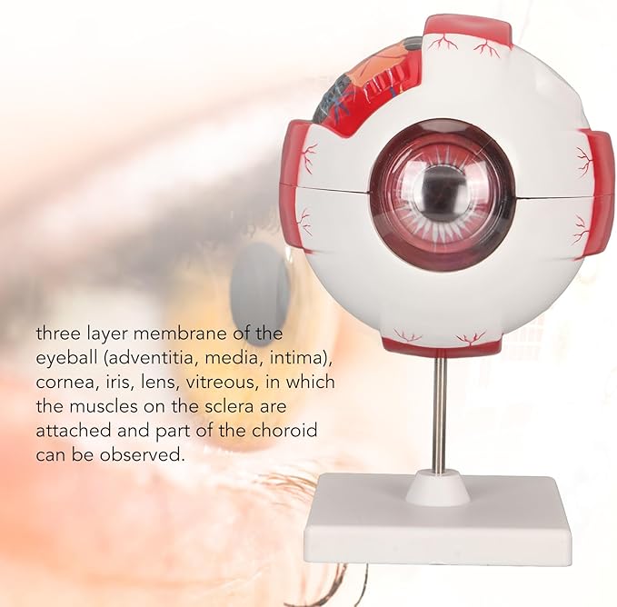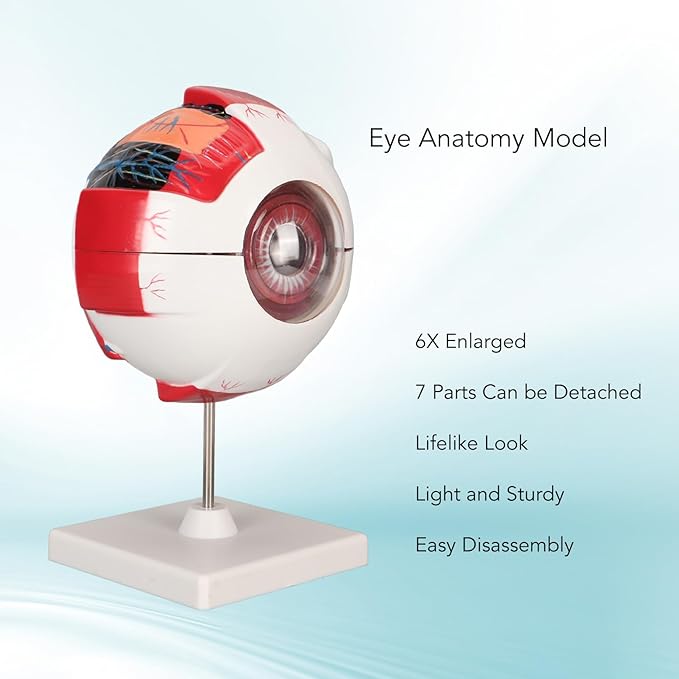 The BusoTh 6X Enlarged Eyeball Model is a detailed human eye replica with 7 removable parts and a sturdy stand. Designed for science education and teaching, it allows easy disassembly to explore eye anatomy in a hands-on and engaging way.