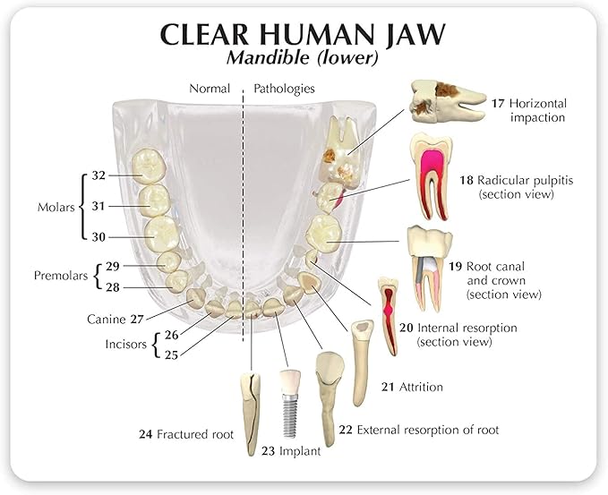 The Transparent Dental Jaw Model is a human anatomy replica featuring teeth and jaw structures. Ideal for dentists, educators, and students, it serves as an effective educational tool for teaching dental anatomy and patient demonstrations.